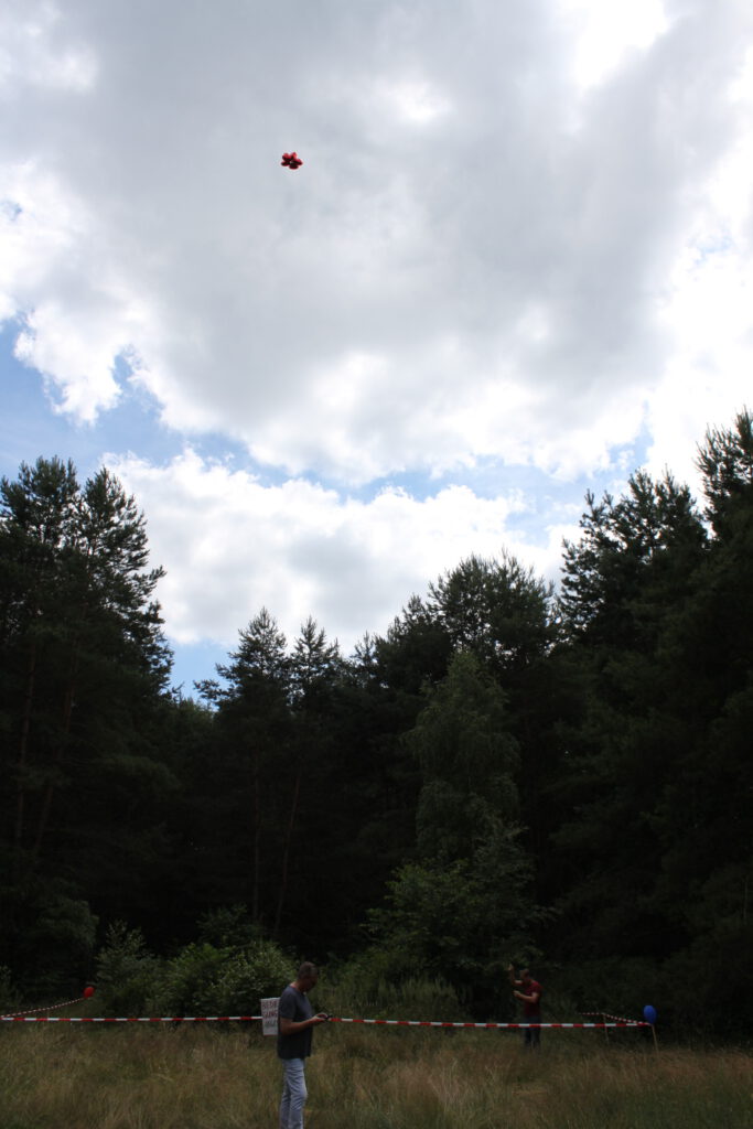 Besonders beeindruckend war der Moment, als Heliums-Ballons auf eine Höhe von 41,3m hochgelassen wurden (auf dem Bild sind sie erst auf halber Höhe) und man sich einen Eindruck verschaffen konnte, wie bedrückend es ist, wenn man unter einem 40m hohen Konstrukt quasi hindurchläuft.