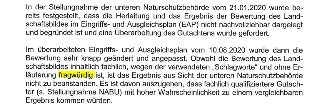 Der Landkreis gibt im offiziellen Widerspruchsbescheid vom 05.07.2021 von Herrn Schley mittlerweile selbst zu, dass das im Baugenehmigungsverfahren verwendete Umweltgutachten (Eingriffs- und Ausgleichsplan) fragwürdig ist.