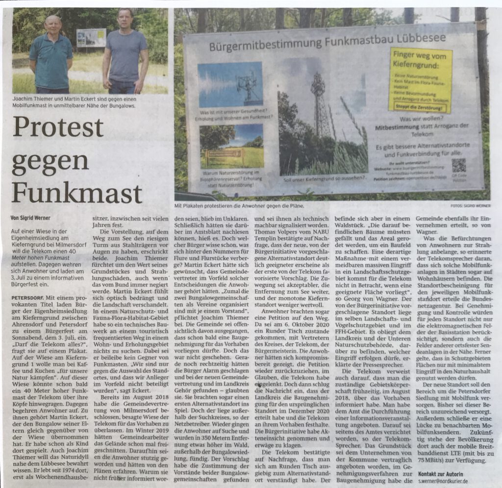 Am 02.07. beschäftige sich der Nordkurier mit der Thematik Funkmast Milmersdorf und veröffentlichte folgenden Artikel: